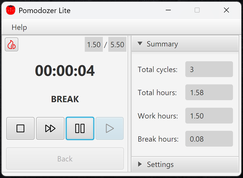 Pomodozer Lite lets you set up a customized work/break scheme, but it doesn’t save your changes — the next time you open the app, it will load the default scheme again.