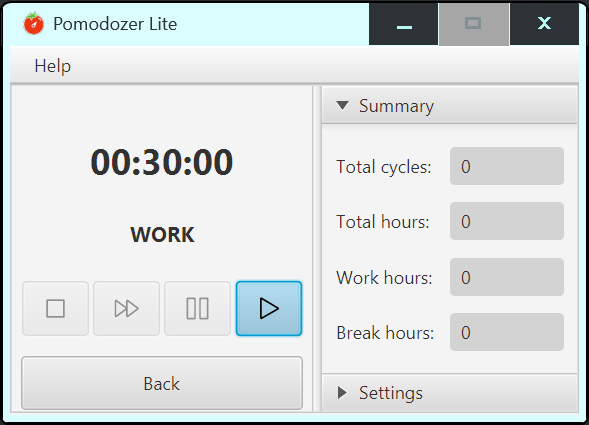 Pomodozer Lite lets you set up a customized work/break scheme, but it doesn’t save your changes — the next time you open the app, it will load the default scheme again.