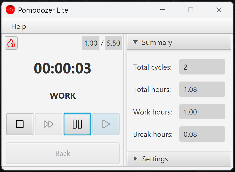 The main timer displays the current interval (Work or Break) and remaining time. You can control the session using the buttons below the timer:
