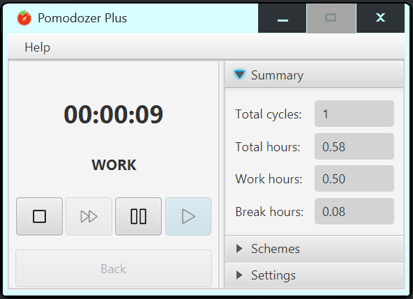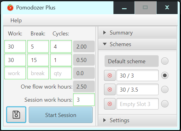 Pomodozer Lite lets you set up a customized work/break scheme, but it doesn’t save your changes — the next time you open the app, it will load the default scheme again.