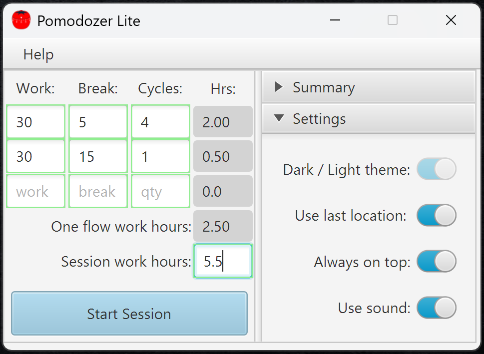 Both Pomodozer Lite and Pomodozer Plus let you set up sessions in two ways: